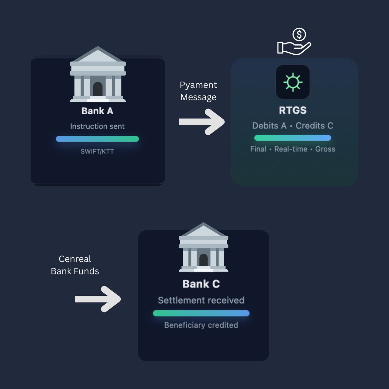 A KTT (telex) payment is only a message that tells banks what to do—debit one account and credit another—but it does not move money by itself; the real transfer happens on settlement rails like correspondent banking (banks using accounts they hold with each other), RTGS at the central bank, or RTP/clearing systems, where balances are actually shifted between banks’ accounts; so for a KTT transaction to be real, the bank must both send the instruction and complete settlement through one of these systems, after which the receiving bank credits the beneficiary.